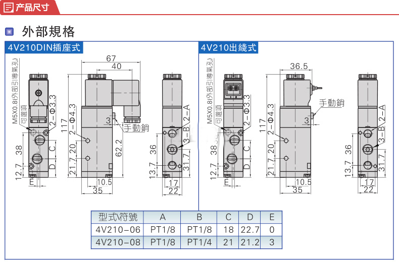 亞德客 內部先導式 電磁閥 2位5通 單電控產品型號: